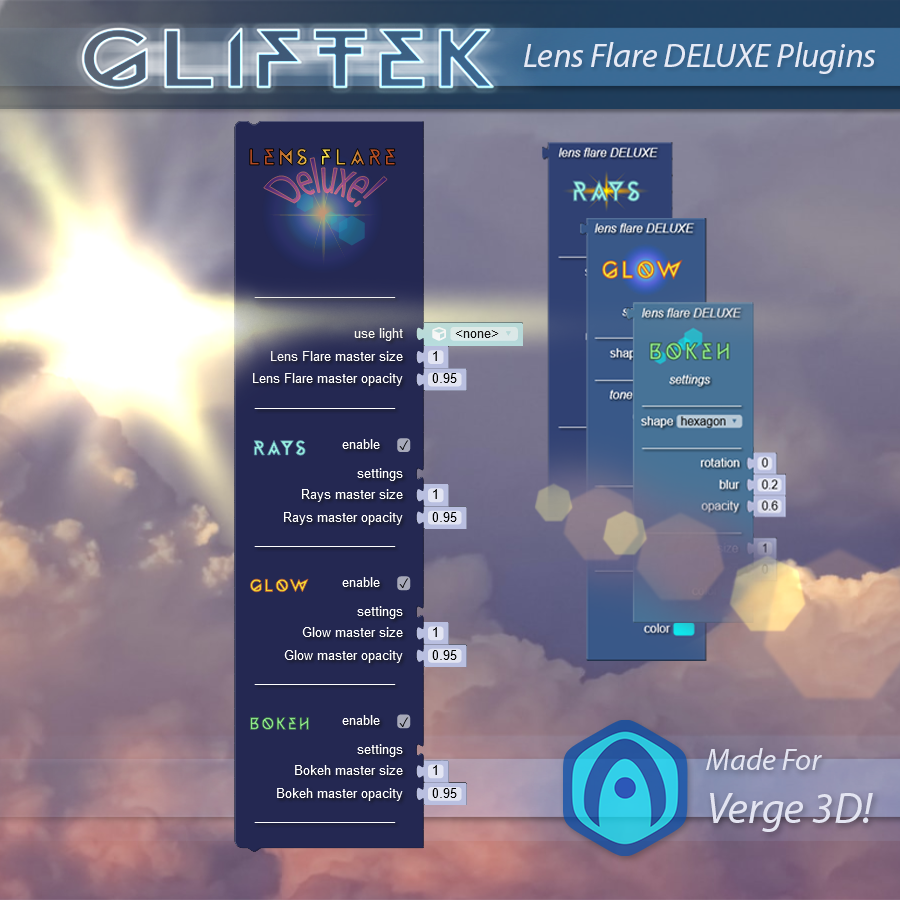 Verge 3D Web Graphics Authoring Plugins - Lens Flare Deluxe produces customizable lens flare effects for online 3D environments, AR/VR etc.